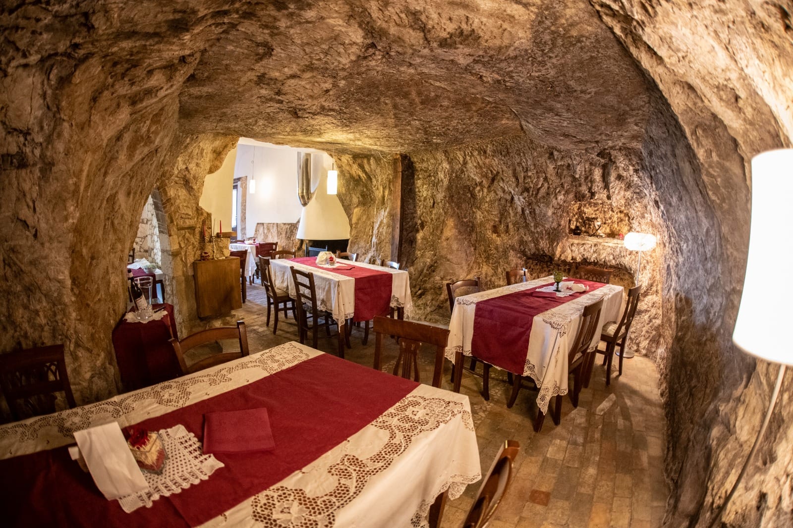 Un ristorante dentro una grotta, scavata nel ventre della montagna, una esperienza da vivere. Una particolarità che a Pretoro, il paese di pietra, è quasi ovvia. Dà una sensazione calda riunirsi intorno ai tavoli, circondati dall'energia della materia naturale. Al ristorante La Torre si arriva percorrendo viottoli silenziosi, passando sotto piccole gallerie scavate nella roccia. È curato nei dettagli, tutto rievoca l’Abruzzo, dalle ceramiche con cui è arredato, agli oggetti in pietra della Maiella, al menu che presenta gustosi piatti e ingredienti tipici della regione e del territorio montano (agnello, ventricina, cervo, formaggi e ravioli allo zafferano, pizza dolce, torta del lupo, dolce bocconotto, ecc.).